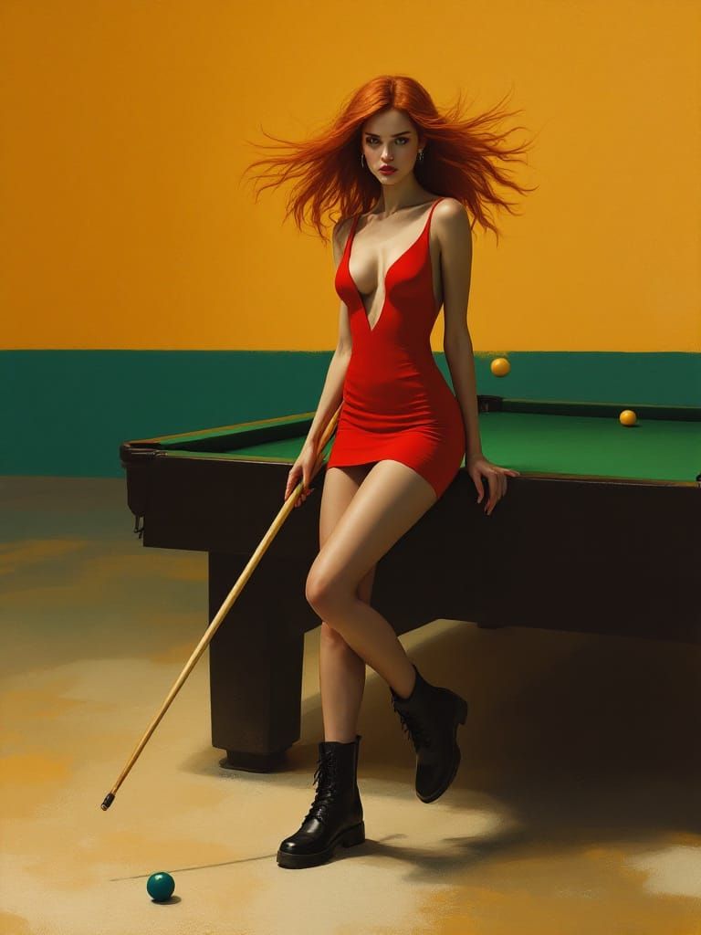 This image depicts a woman with red hair holding a pool cue, set in a dimly lit pool hall. The style features warm, minimalist tones and flattened color planes, creating a contemplative atmosphere.