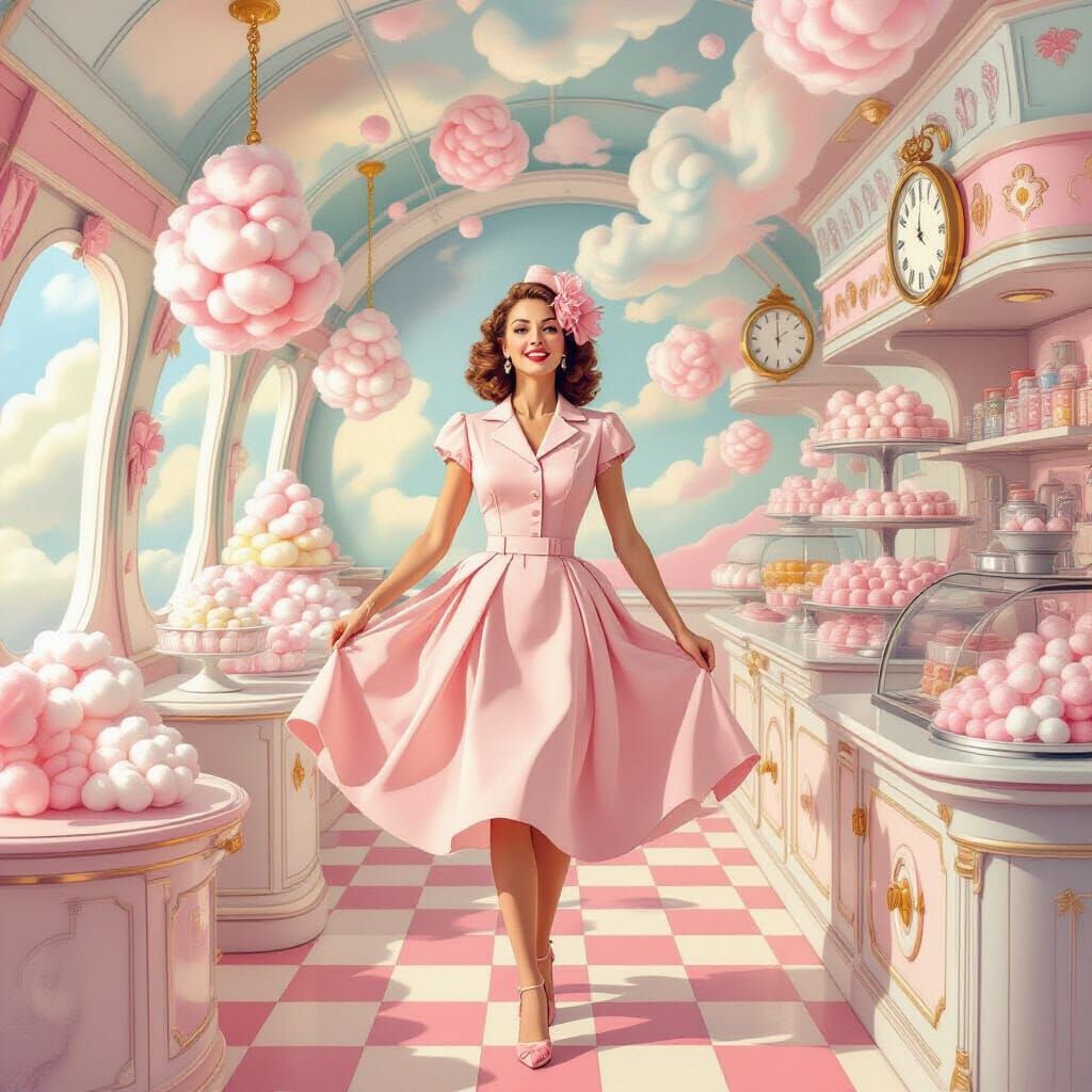 A vintage advertisement featuring a woman in a 50s dress at a cotton candy shop on an airship. The image has a surreal, dreamlike quality with pastel colors, reminiscent of oil on canvas.