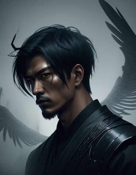 This haunting oil painting captures the mystical essence of a surreal Asian angel of death, set against a backdrop of soft, monochromatic lighting and ethereal mist, with bold brushstrokes and dark feathers that evoke a sense of eerie fantasy.