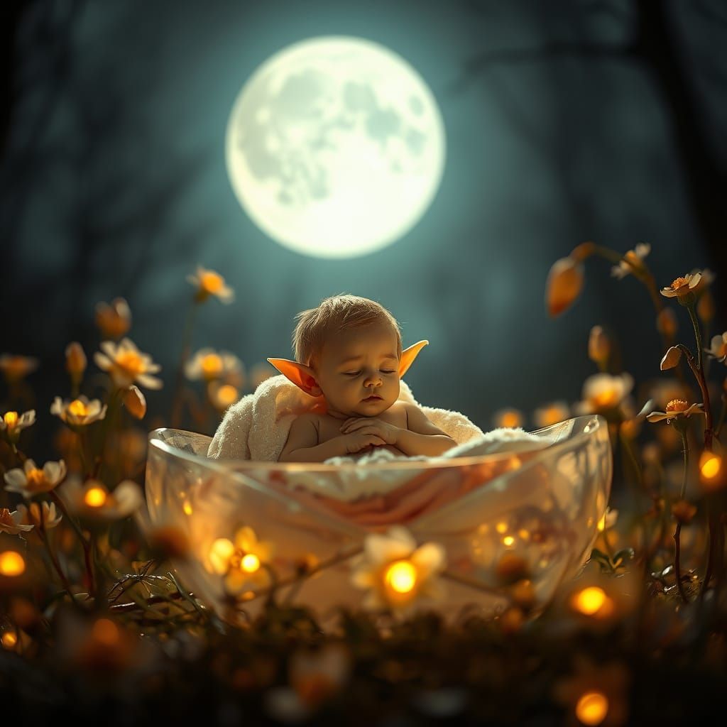 This image shows a wood elf baby nestled in a crystal crib, encircled by luminous flowers under a full moon. The scene is lit with warm hues, creating a cinematic and dramatic atmosphere.