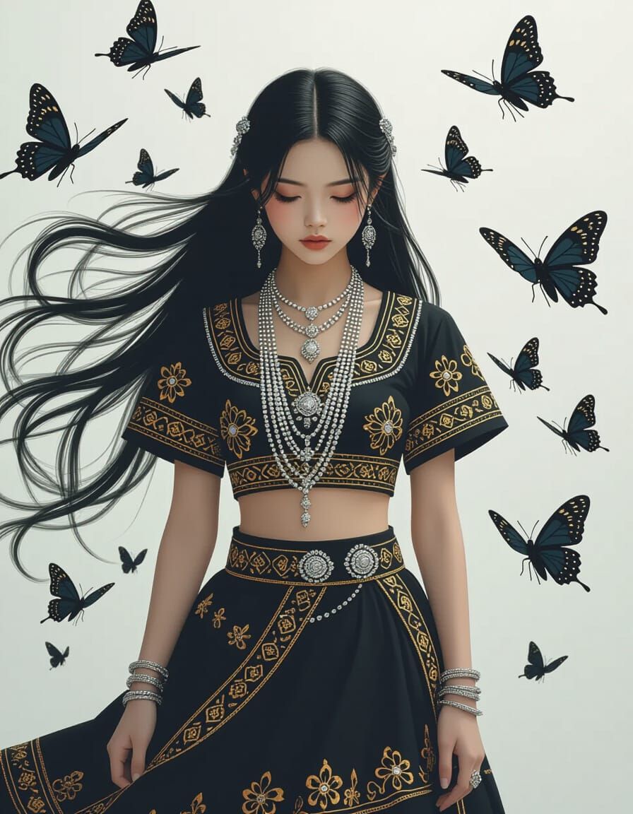 This image shows a beautiful Hmong woman in traditional attire as she transforms into a swarm of moths. The surreal image features cinematic lighting and a mystical, realistic style.