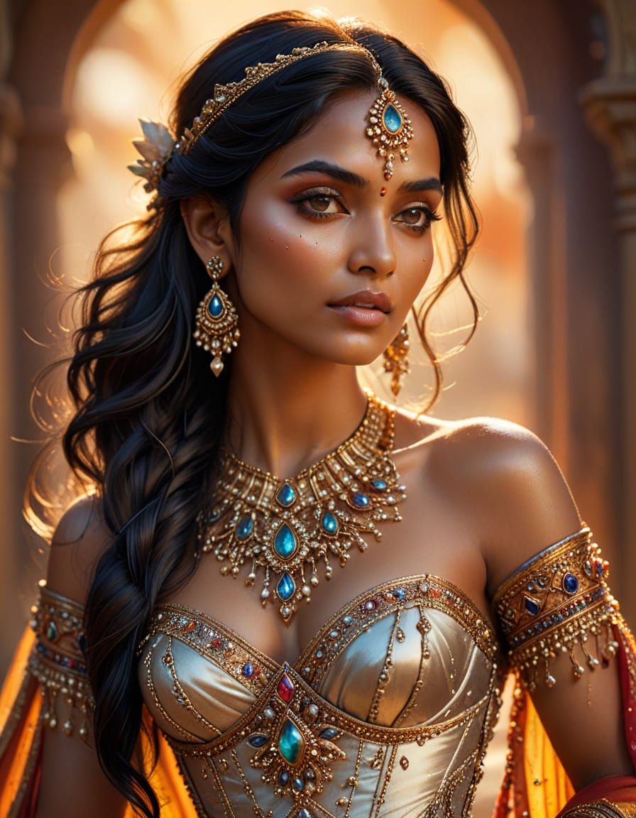 Concept art of an ethereal Indian woman adorned in a jeweled silk corset, showcasing intricate details and opulent gemstones under warm, golden hour lighting. Digital fantasy art.