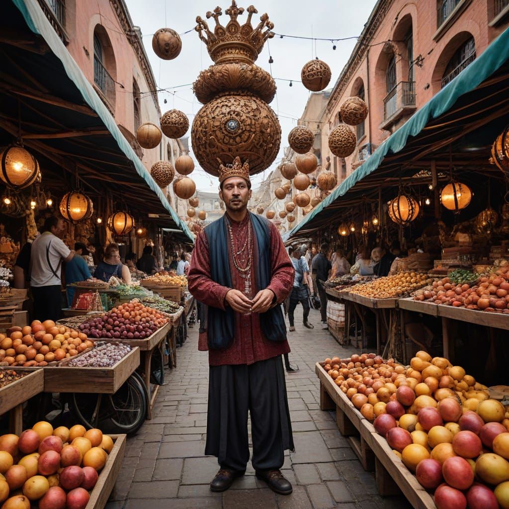 A bustling, vibrant marketplace in a fantastical city where vendors sell exotic fruits and shimmering fabrics. In the center, a street performer juggles glowing orbs while wearing a crown made of intricately carved wooden gears and polished copper pipes. The atmosphere is alive with color and movement, depicted in a dynamic, painterly style with a touch of magical realism.