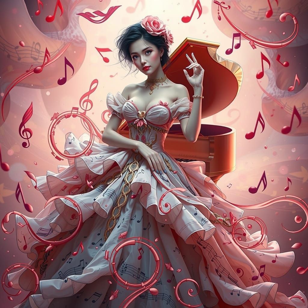 A woman in an elegant dress inspired by a piano, surrounded by musical elements. The image blends a whimsical style with romantic and elegant art nouveau aesthetics.