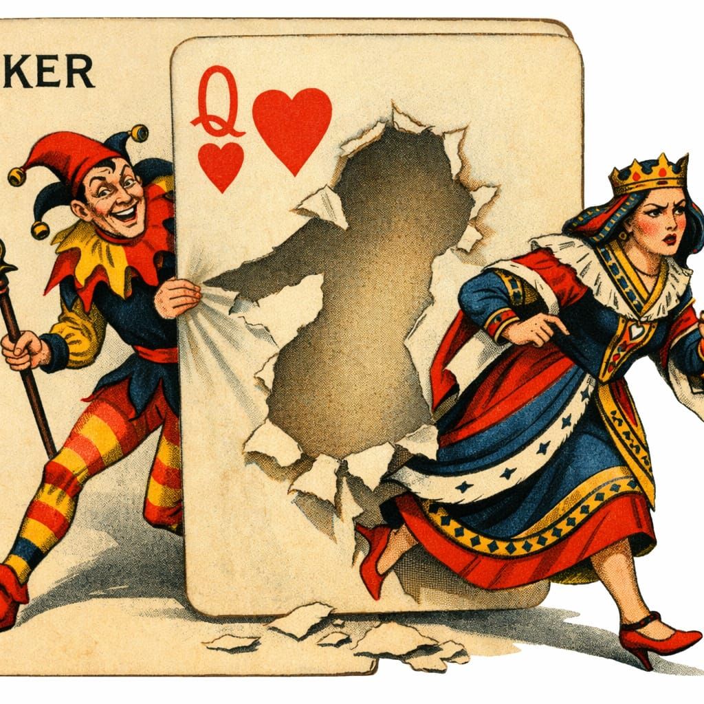 This image depicts a dramatic scene with Joker and Queen of Hearts playing cards from the 1930s. The Queen of Hearts breaks away from the Joker, who is trying to flee with her. The card art style evokes vintage playing card designs.