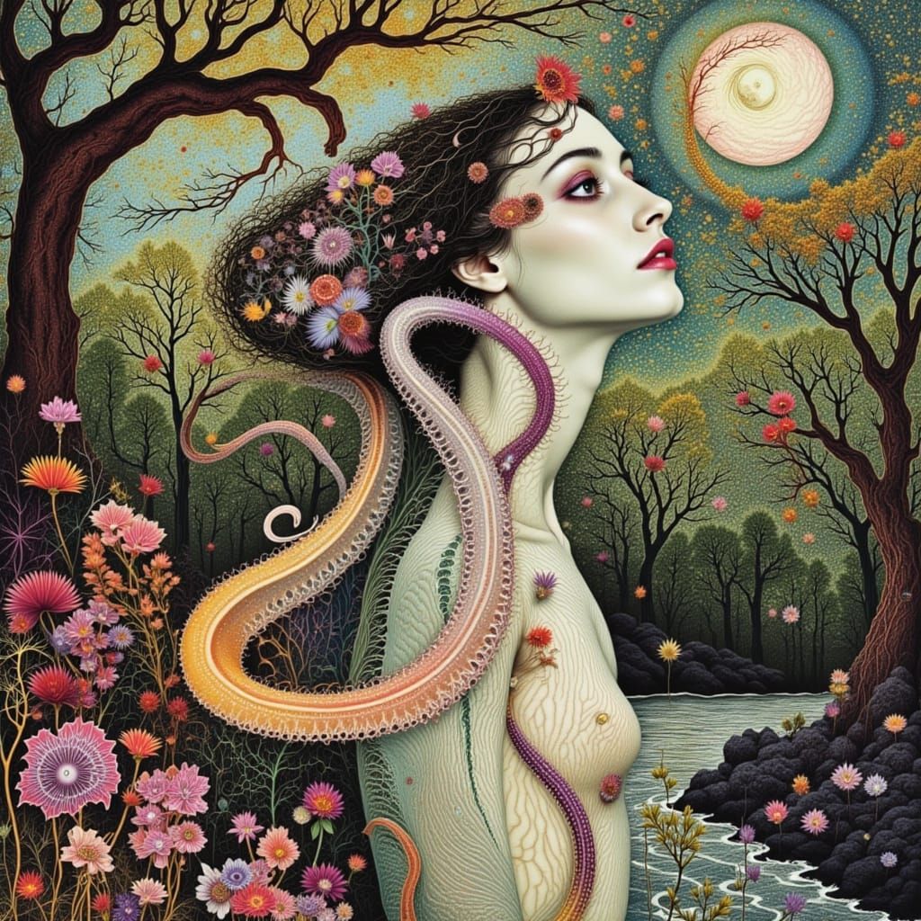 This image shows an ethereal woman with a long neck in an ancient forest, surrounded by glowing microbes and plants. The composition blends photorealism with organic, vibrant textures and fractal details.