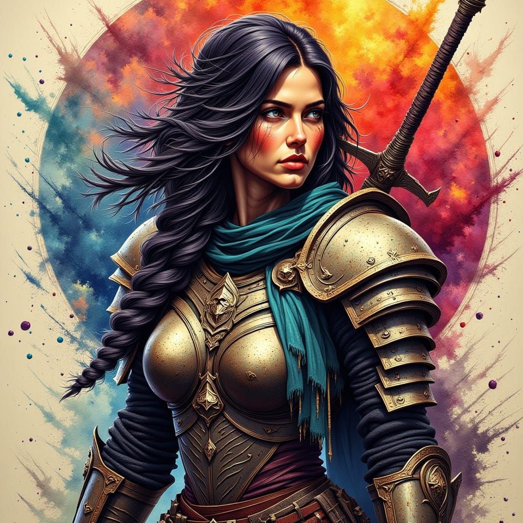 This image features a striking warrior princess with breathtaking beauty and detailed armor, presented in a cinematic style with flowing ink lines and watercolor washes. Dramatic lighting enhances the jewel-toned palette.