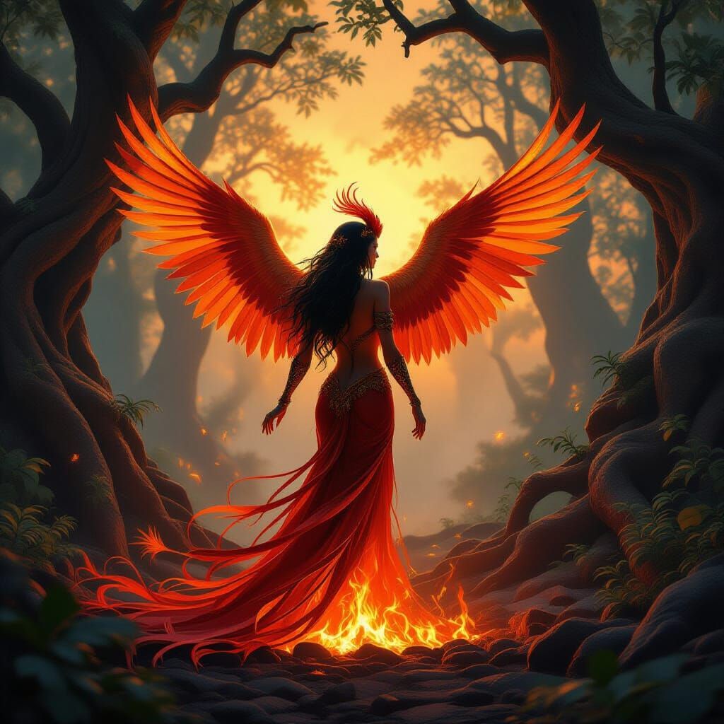 This image shows a majestic phoenix-human hybrid woman with sunset-colored feathers emerging from glowing embers in an ancient, mystical forest. Rendered in detailed fantasy concept art style.