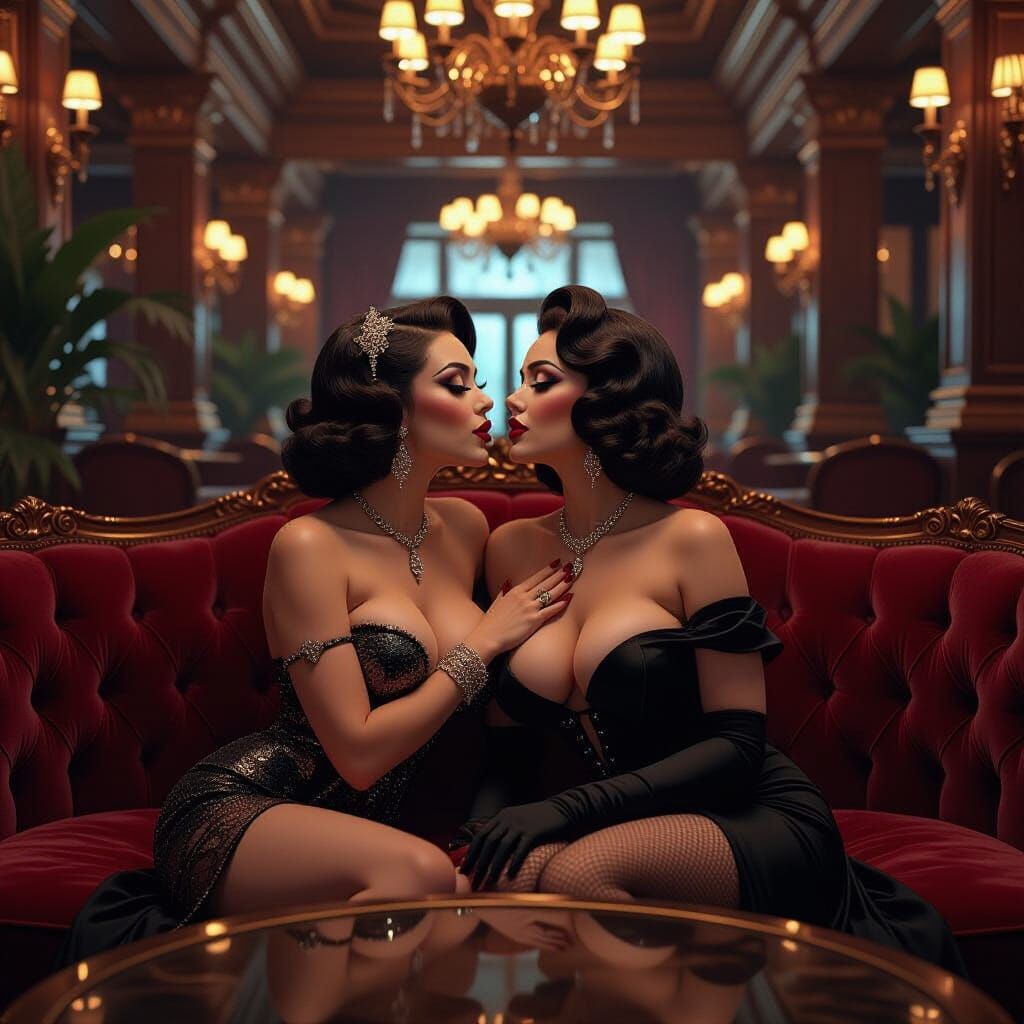 This highly detailed matte painting depicts a burlesque couple intimately kissing and touching on a plush velvet sofa. The scene features dramatic lighting, deep colors, and fantasy concept art elements, creating a luxurious atmosphere.