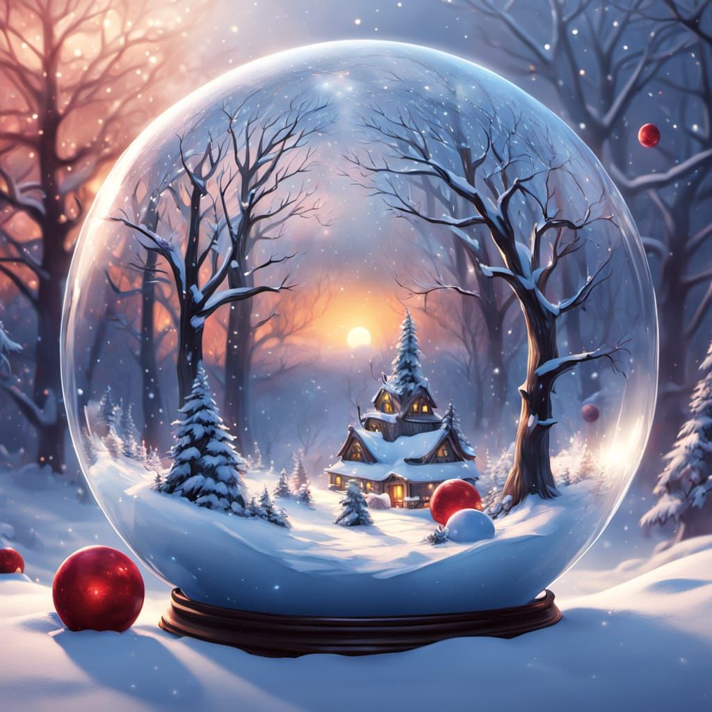 This digital matte painting captures Snow White celebrating New Year within a transparent sphere, with magical sunset hues and swirling snowflakes outside. Fantasy concept art with an ethereal glow.