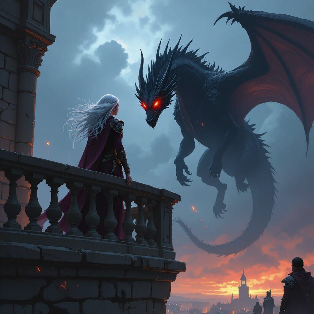 A dramatic image of Violet Sorrengail on a balcony, with her dragon Tairn. The scene, set against a stormy sky, evokes a dark fantasy aesthetic with cinematic lighting and rich detail, reminiscent of concept art.