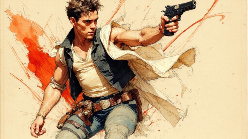 A dynamic, high-energy color sketch of Han Solo in a comic book ink wash style. Features bold shading, ink splatters, and vibrant colors on aged paper.