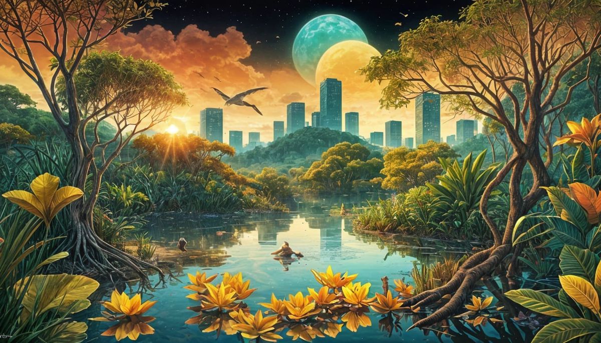 This image shows a vibrant mangrove forest at sunset, teeming with wildlife. Golden light filters through the trees, creating long shadows and reflections in this hyperrealistic nature scene.