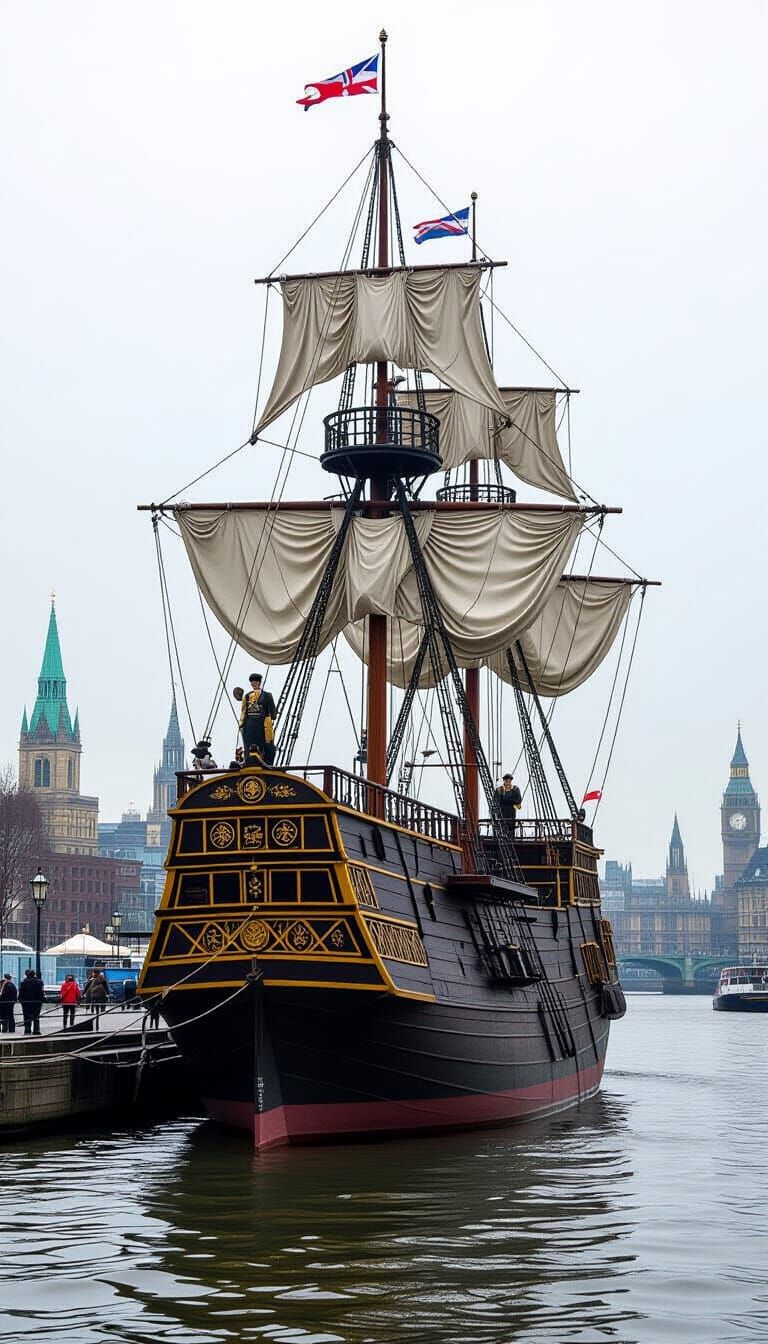 This image shows a majestic, Victorian-era spaceship launching from a foggy, London-esque port. The artwork is in a steampunk style, blending industrial fantasy elements with streamlined designs.