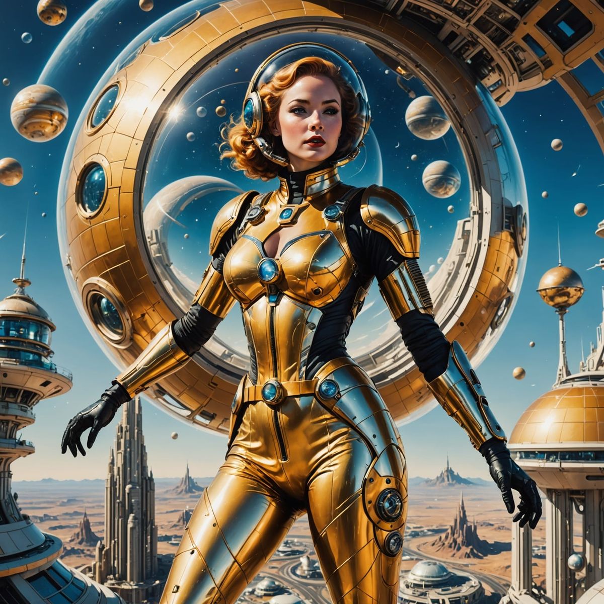 This image shows a young woman in a golden space suit soaring above Venus. A domed city floats in the background, rendered in a hyperrealistic, colorful retrofuturistic style.