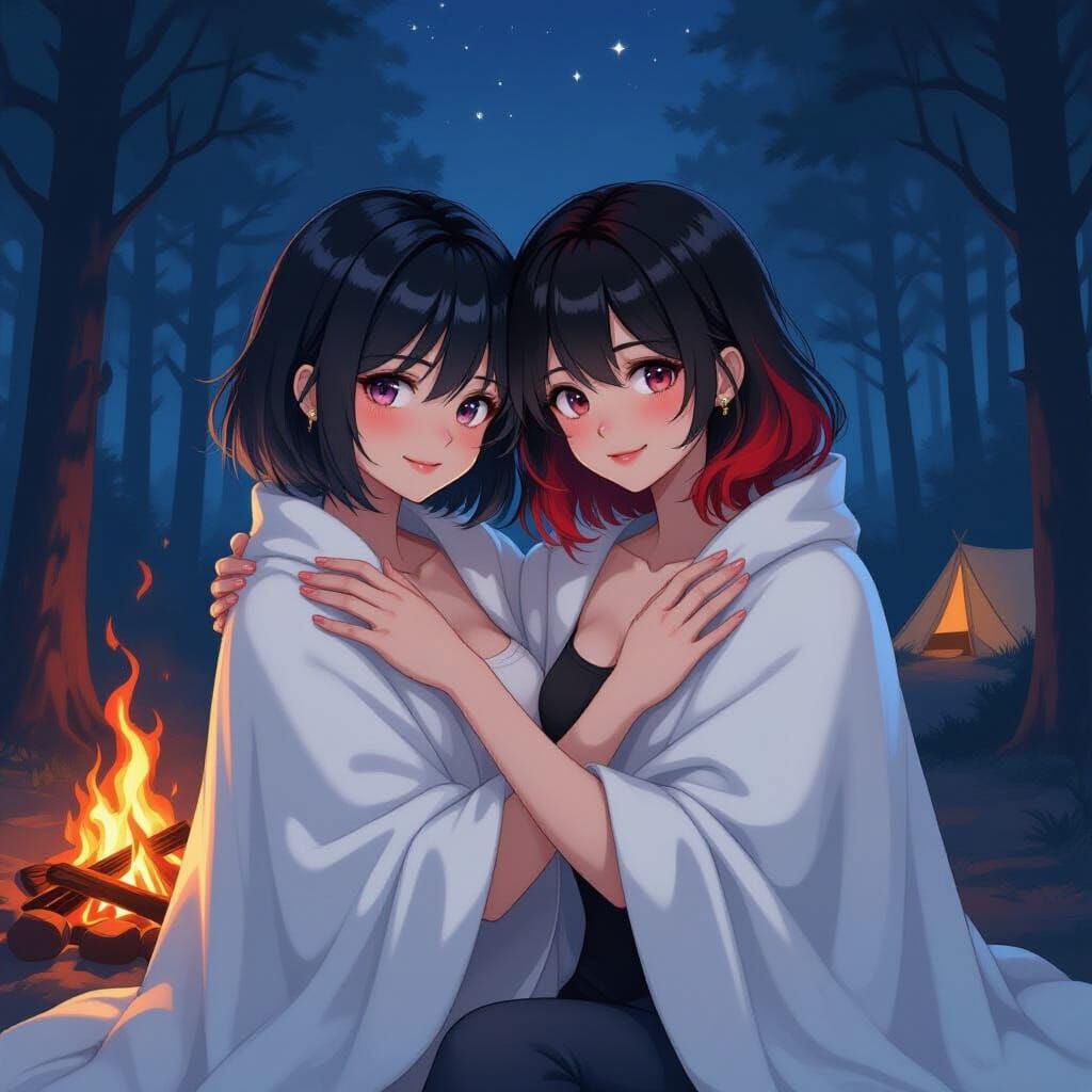This image shows two young women embracing in a forest clearing at night. They are wrapped in a blanket, with a fire and tent visible in the background in a vibrant anime style.