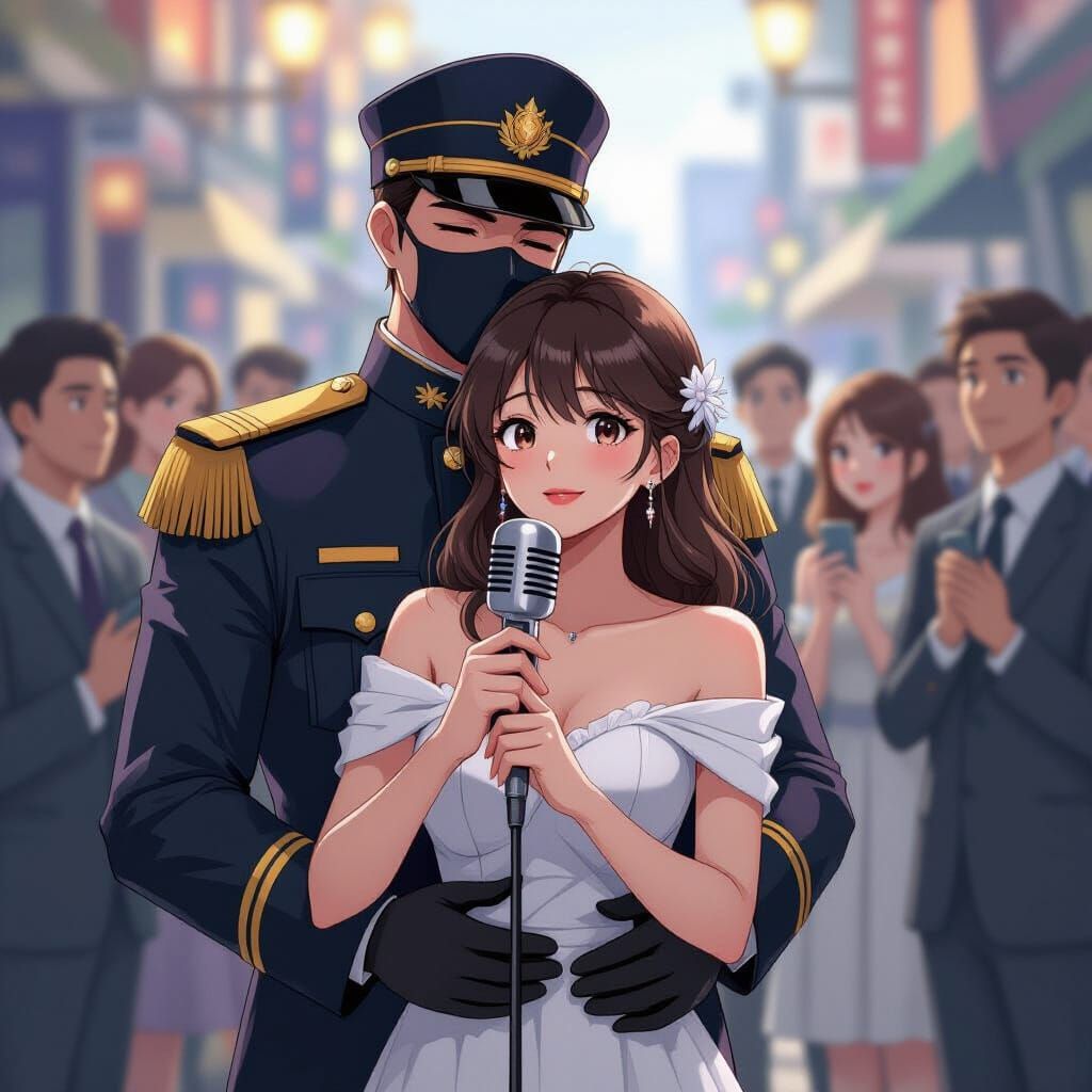 This image shows a masked general captivated by a singer's performance. Rendered with cinematic lighting and cel-shaded techniques typical of anime, the artwork evokes a sense of deep emotion and hidden identity.