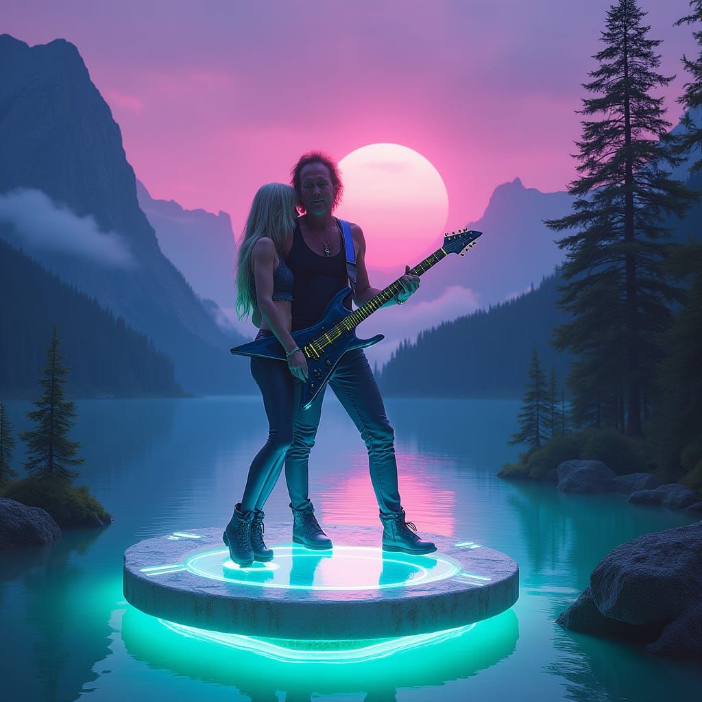 A realistic image shows Bruce Dickinson performing on a stage floating on a green-blue alpine lake. The sun sets in vivid purple as he plays a blue Flying V guitar in a futuristic digital art style.