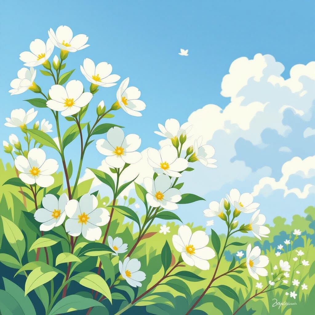 A striking picture of clusters of Mayflower blossoms against a bright blue sky. The image evokes art nouveau and impressionist paintings, using soft gradients and vibrant, natural colors.