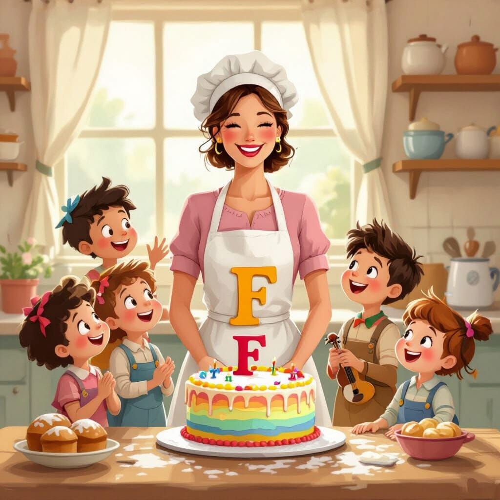 This image shows a mother in a baker's outfit standing next to a cake with the letter F on it. Seven children representing musical notes surround her in a whimsical style.