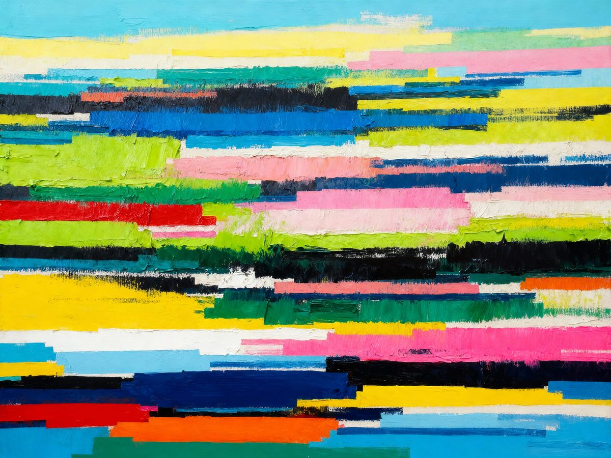This image showcases a dynamic color field painting featuring distinct horizontal stripes and layers in a bold palette, created with thick, expressive brushstrokes in an abstract expressionist style.