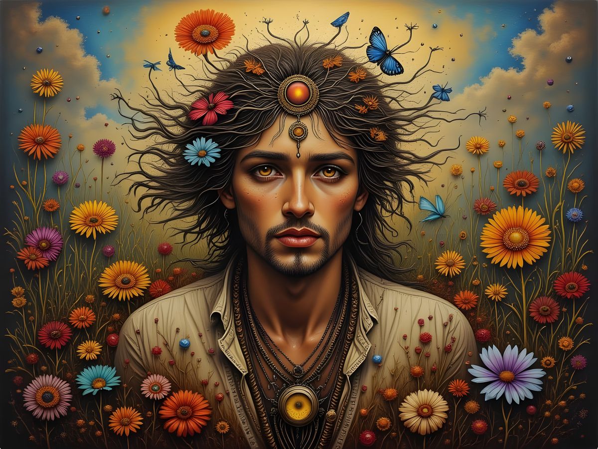 This image shows a bohemian man with glowing eyes in a mystical floral tapestry. The artwork features a hand-drawn, intricate style with a focus on natural flow and freedom.