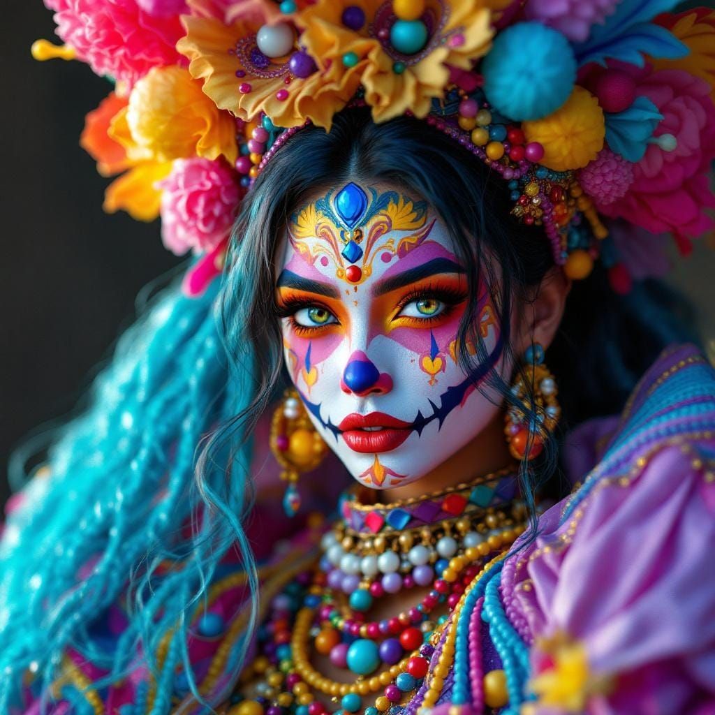 This image shows a vibrant Chola woman with long, flowing hair and bright eyes. She is wearing colorful clothing and striking clown face paint, rendered as highly detailed 3D anime art.