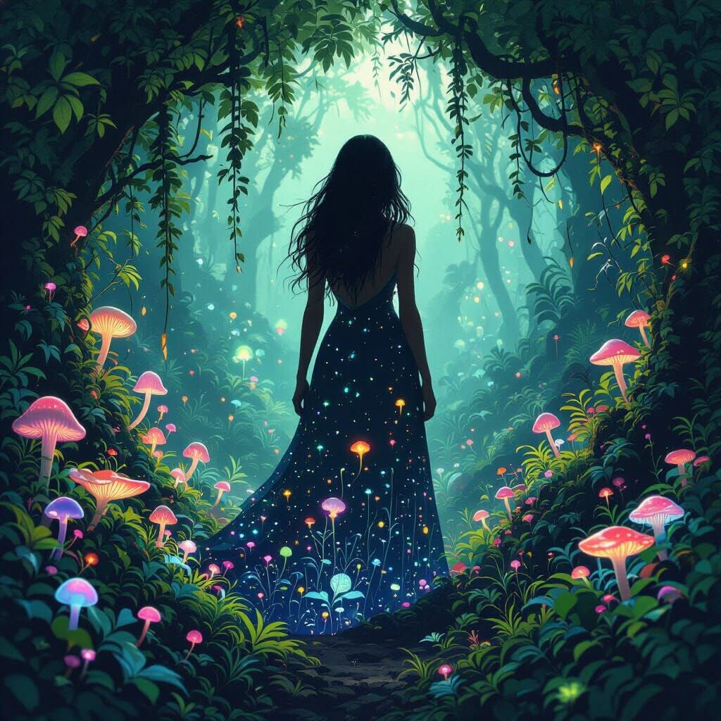 This image depicts a hyperdetailed illustration of a woman in an overgrown forest. Plants and fungi glow with bioluminescence, creating a surreal, otherworldly atmosphere.