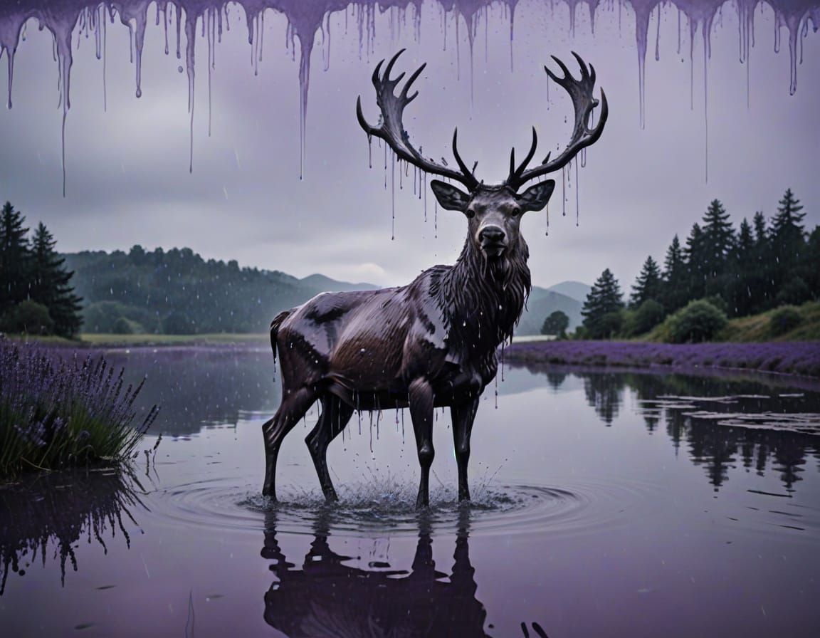 This image depicts a transparent stag formed from flowing water, with droplets falling from its antlers, set against a lavender sky and dull lake.