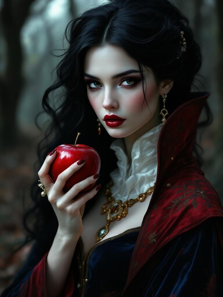 This image shows a sinister queen in a dark fairytale portrait. She holds a red apple, her porcelain skin and intense eyes enhanced by moody lighting and intricate costume design. The artwork has a gothic fantasy aesthetic.