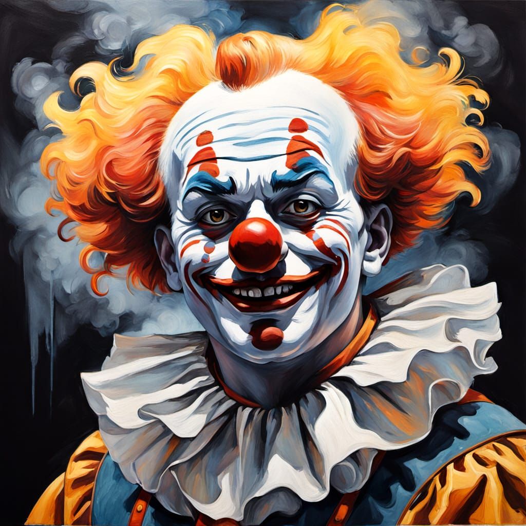 A close-up charcoal drawing of a clown magician performing at the circus. The image shows an ethereal fantasy scene with golden hour lighting and warm colors in gouache style.