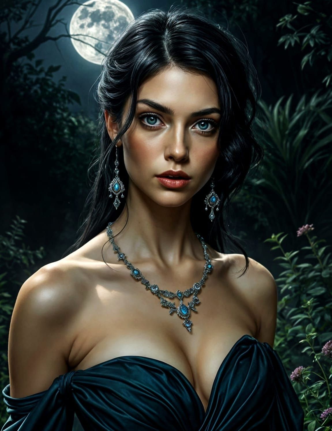 A striking picture of an Italian woman sculpted from obsidian, standing in a moonlit garden. She wears a midnight blue gown and silver jewelry. The image is reminiscent of chiaroscuro paintings.