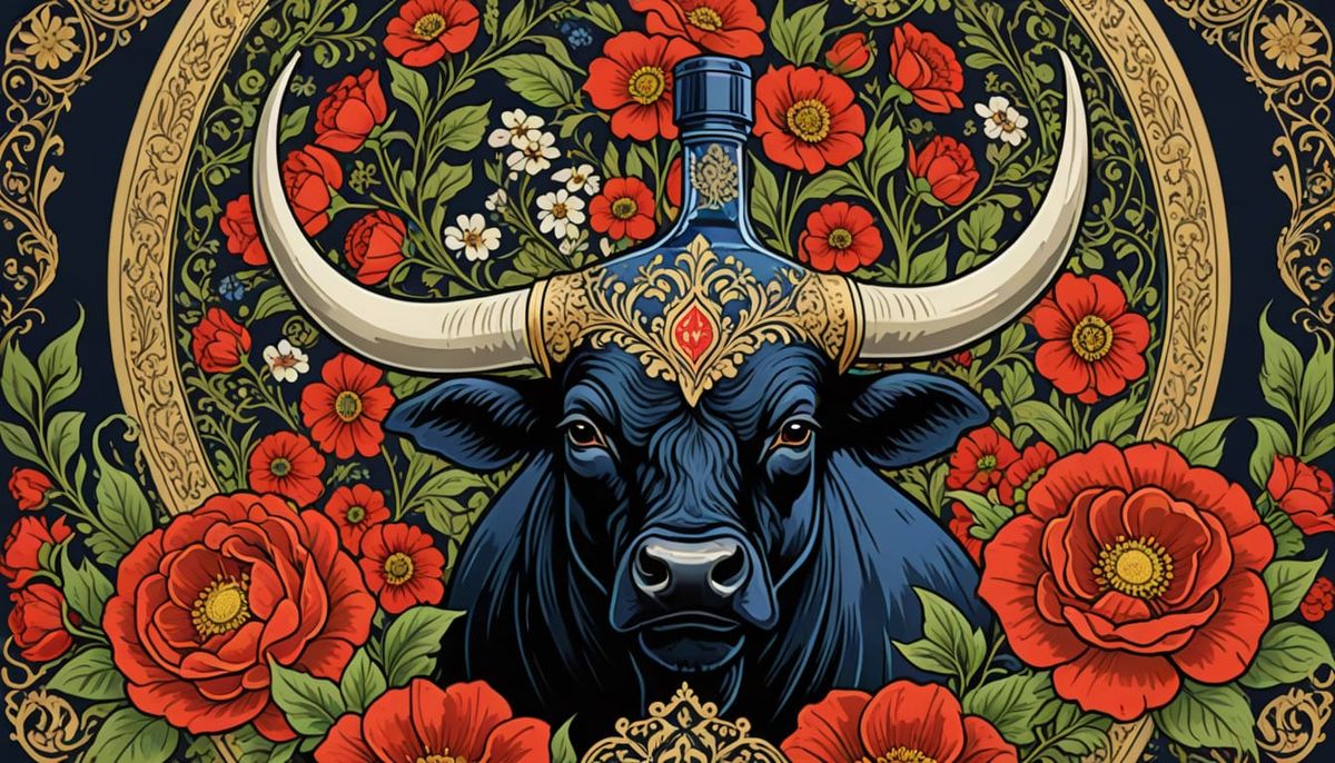 This image showcases a Palekh art style vodka label with a bull surrounded by flowers, a classic motif in Russian lacquer art. The intricate design is characteristic of Palekh's distinctive style.