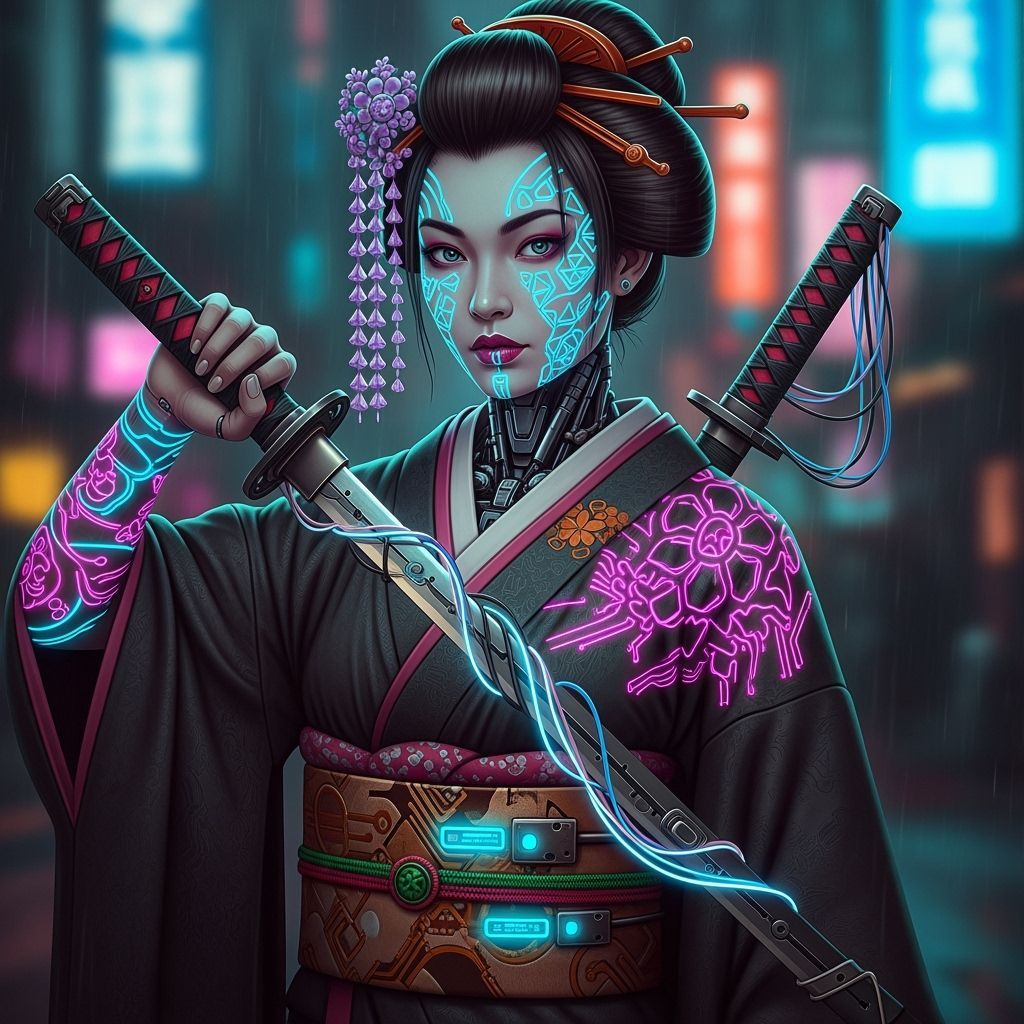 A striking picture of a cyberpunk geisha in traditional clothing with glowing neon tattoos and a katana. This image is a photorealistic anime artwork with gritty textures and cinematic lighting.