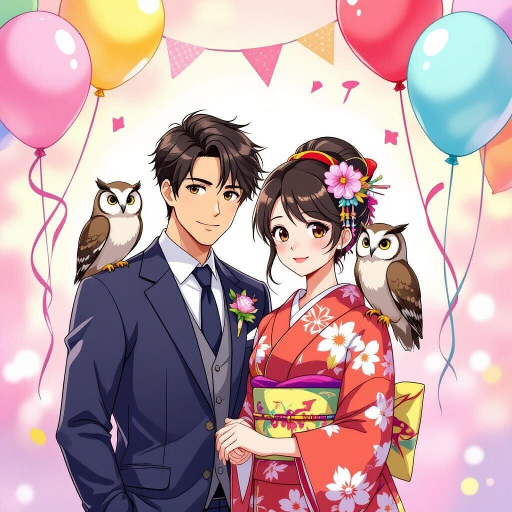 This image shows a dapper man in a suit and an anime-style woman in a kimono celebrating with their owl. The scene is festive, with balloons and streamers in pastel colors, rendered in an anime aesthetic.