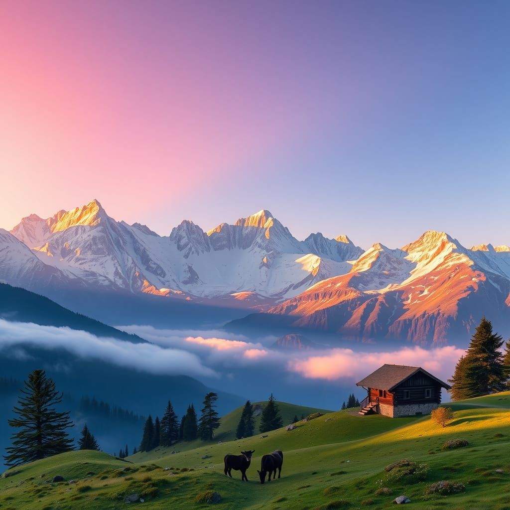 This serene landscape painting depicts a breathtaking sunrise over the Swiss Alps, with golden sunlight illuminating snow-capped peaks and alpine meadows, set against a clear blue sky with warm orange, pink, and lavender hues.