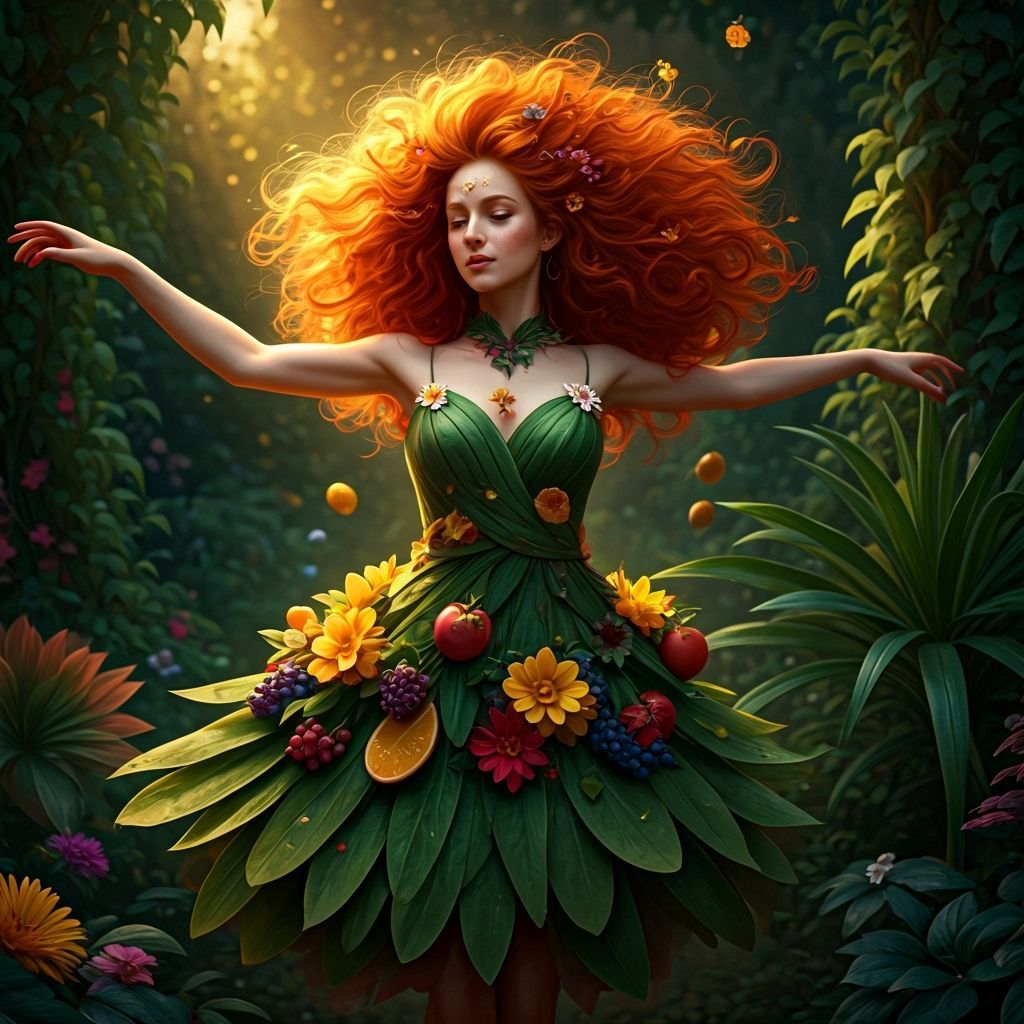 A striking picture of the Irish goddess Aine dancing in a summer meadow. She has vibrant red hair and wears a dress of flowers and fruit. Digital matte painting with deep colors and intricate textures.