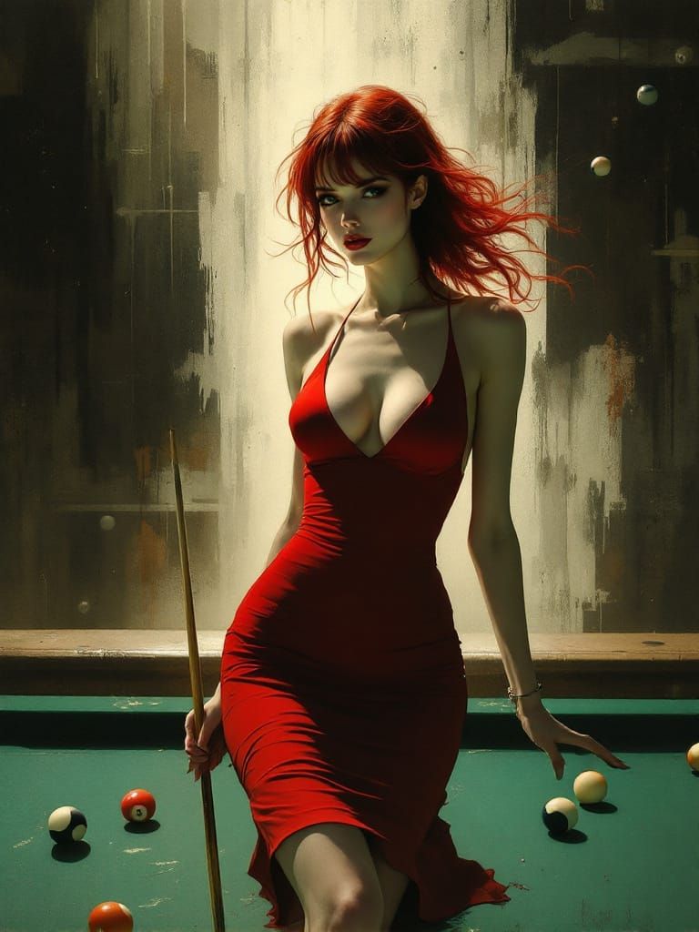 This image captures a confident woman with flowing red hair, holding a pool cue in a dimly lit pool hall. The art style blends veiled luminosity with graphic tension and sophisticated restraint, using ivory and umber tones.