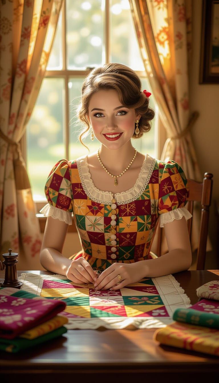 A captivating image of a woman in a 1960s dress sewing a quilt. Sunlight streams through the window, illuminating the scene. The artwork evokes the styles of classic American illustrators.