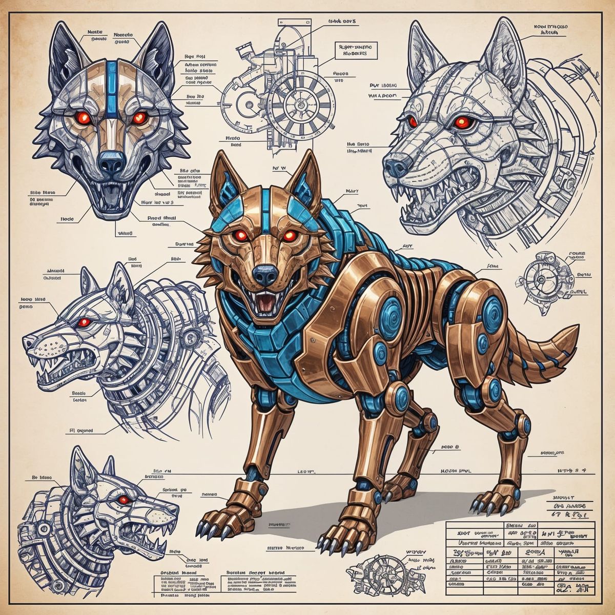 A magnificent mechanical wolf crafted from polished copper and accented with striking blue-teal metal along its joints, spine, and tail. Its glowing red eyes and intricate clockwork components give it a powerful, lifelike presence. The wolf stands proudly at the center of a sprawling blueprint layout, ...