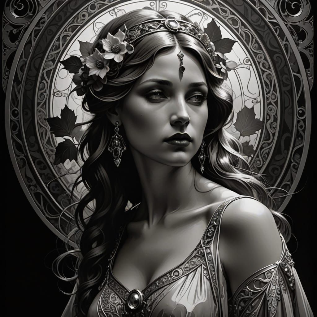 This image is a striking example of modern art, blending the mystique of film noir with the photorealistic style of Alphonse Mucha, creating a hauntingly beautiful and elegant scene