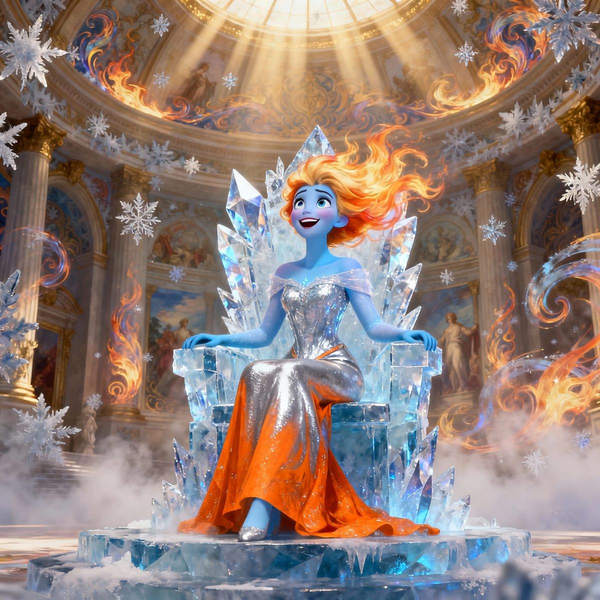 This image features a regal goddess with icy blue skin and fiery hair, dressed in silver and orange. She sits on an ice throne in a grand palace, with a joyful expression. The style blends Disney's Frozen with Renaissance art.