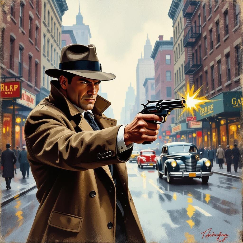This image shows a vintage detective in an oil painting style, aiming a handgun on a busy street. It captures the dramatic atmosphere of a classic film noir.