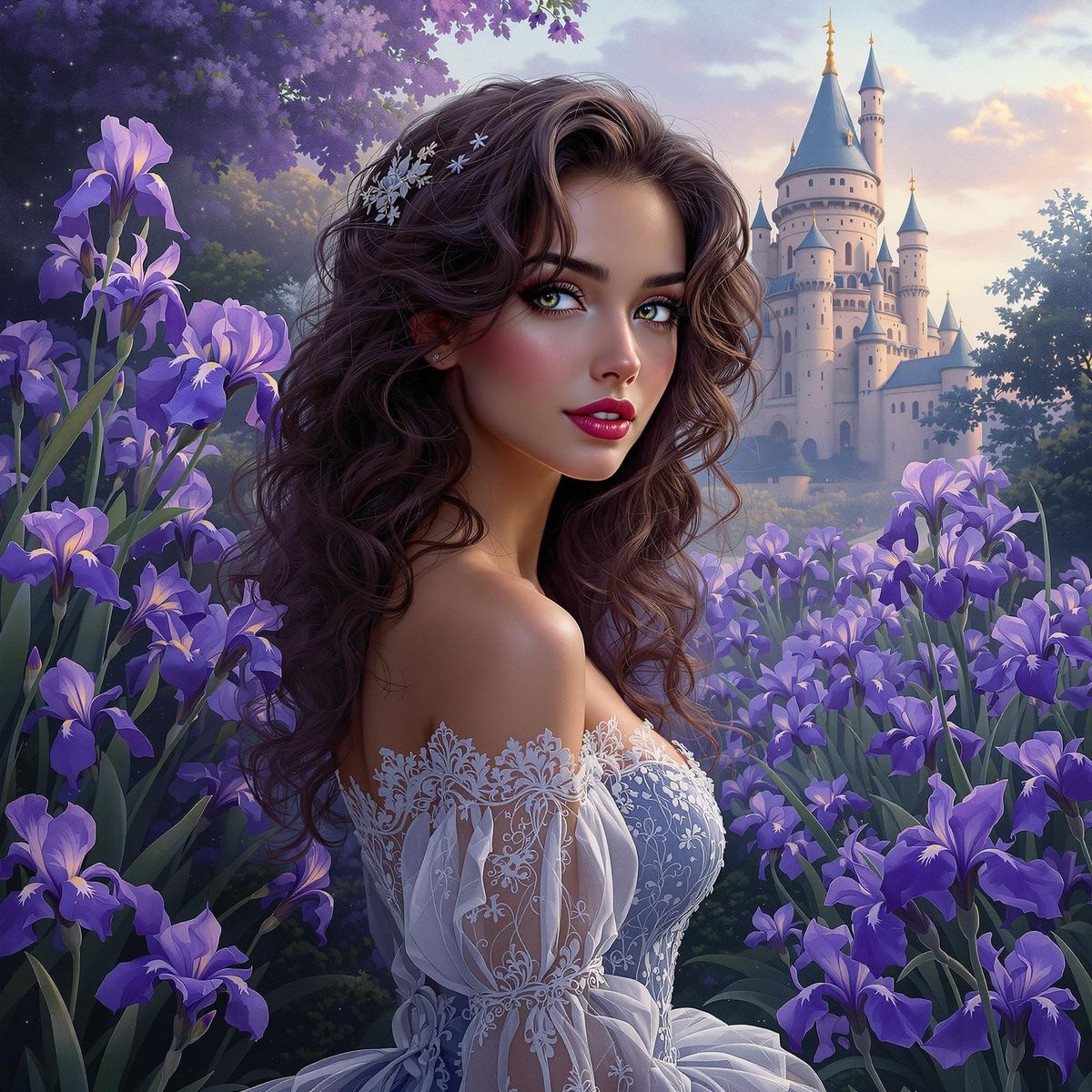 A beautiful woman with curly brown hair with dark purple highlights, a gray and white dress wearing a woman’s short, princess style lace, long sleeve dress, standing next to a midnight Iris flower garden, background garden with a round castle tip shimmering effect, glowing effects, detailed, Trompe-d‘l’oeil, ...