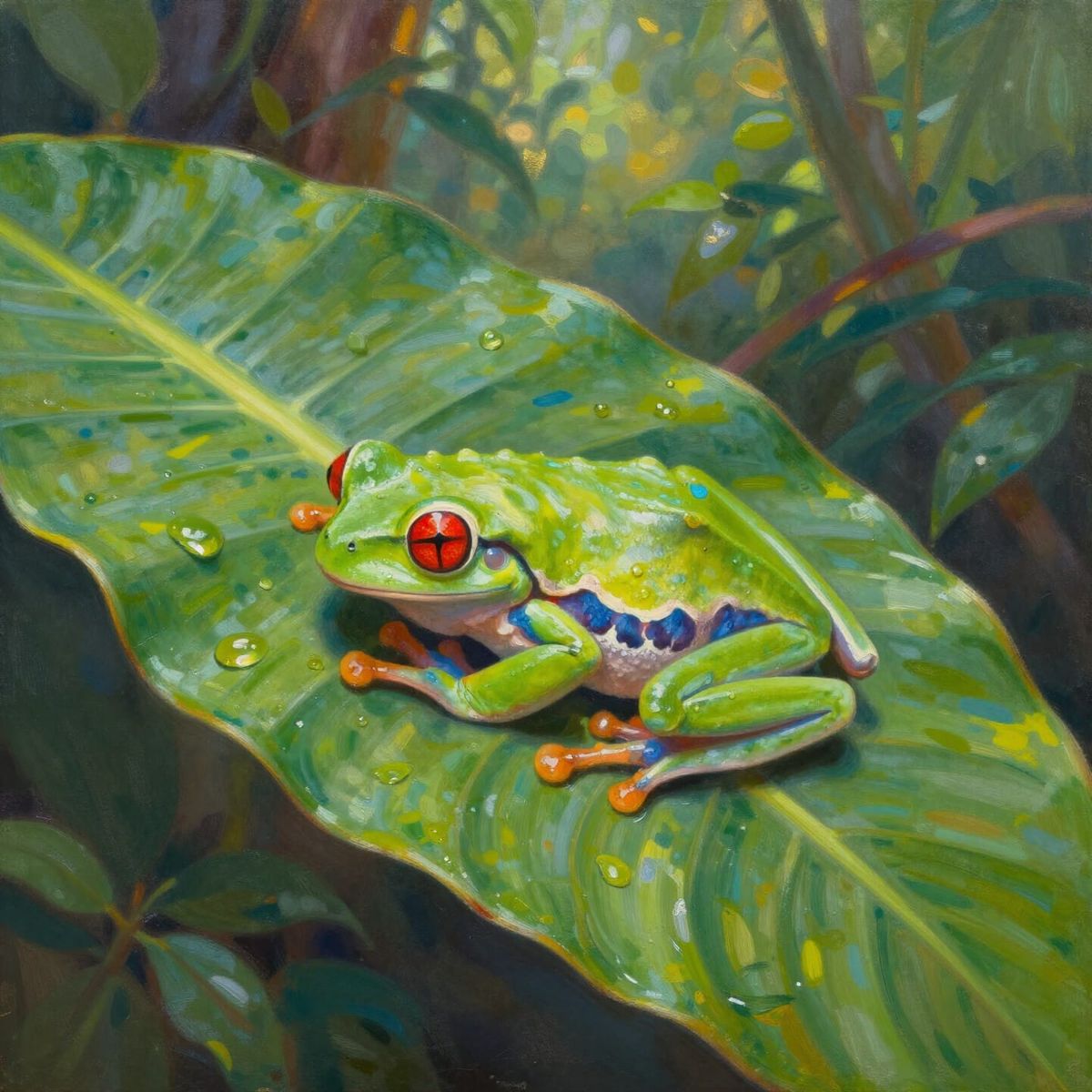 This impressionistic oil painting captures a red-eyed tree frog sleeping on a large tropical leaf. Dappled light and a humid atmosphere enhance the rainforest scene.