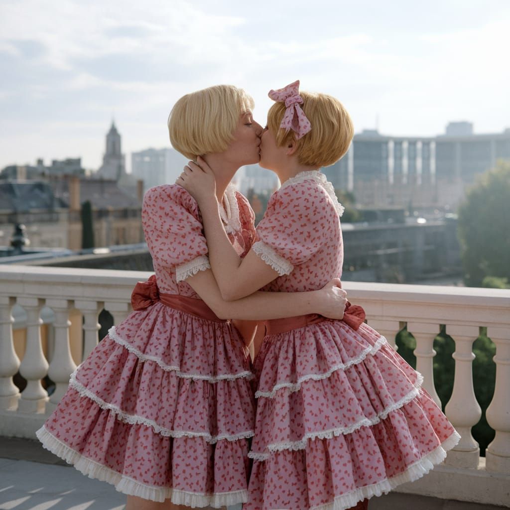 This cinematic image captures a couple embracing on a terrace, both wearing matching frilly dresses. The shot features film grain and atmospheric lighting, creating a dramatic and stunning scene.
