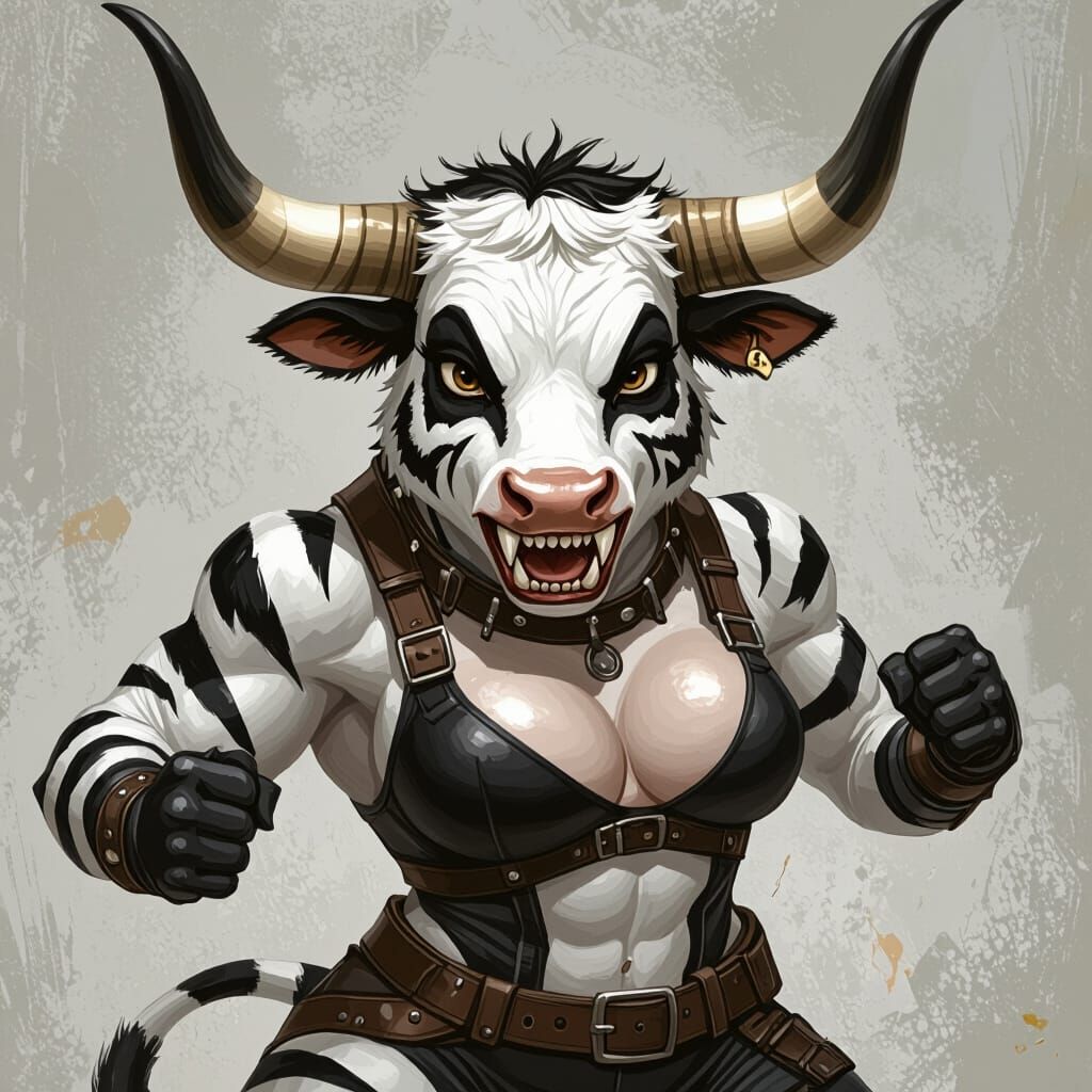 This image shows an anthropomorphic Holstein cow with tiger stripes and sharp teeth, in a dynamic pose. The artwork blends digital painting and comic book elements, with an emphasis on muscular anatomy.