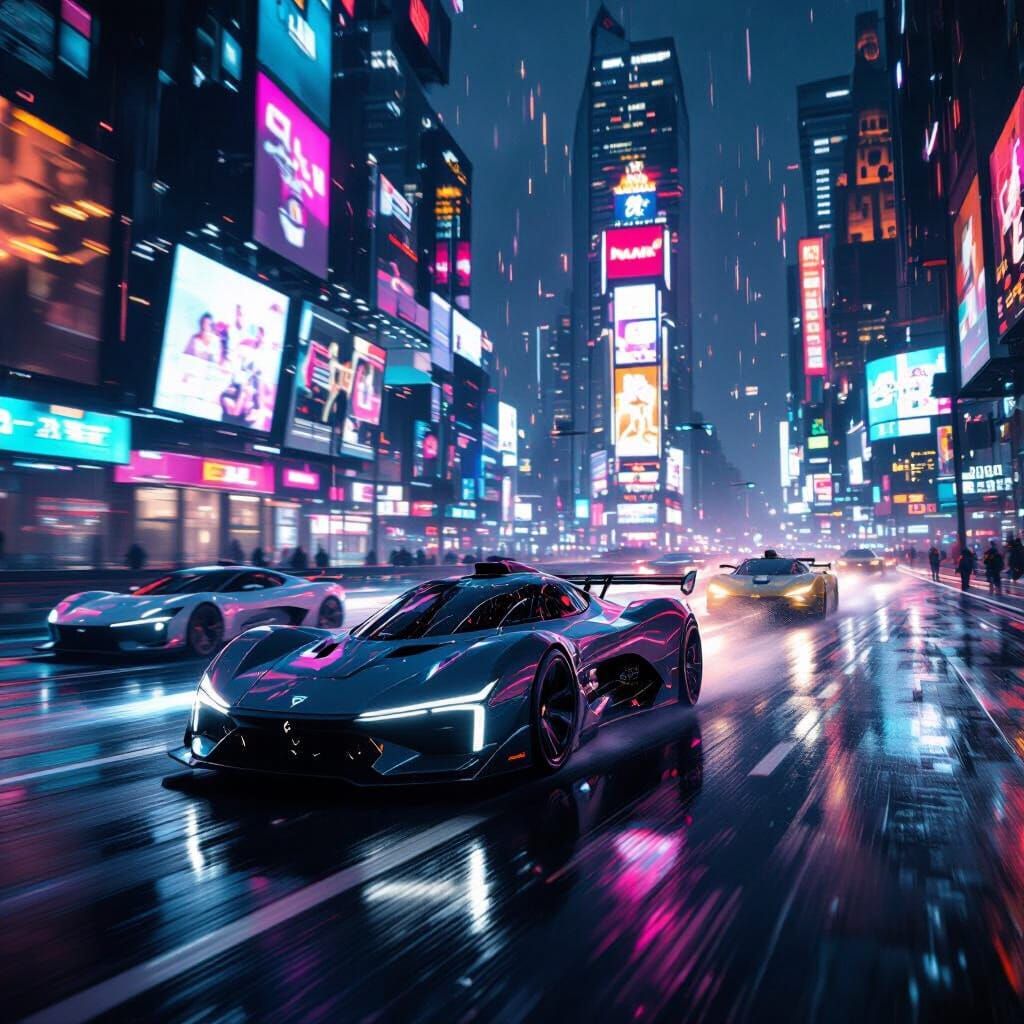 A high-speed cyberpunk race through a neon-lit city at night. Sleek electric cars speed through rain-slicked streets reflecting holographic ads and skyscrapers. Cinematic lighting and film grain enhance the scene.