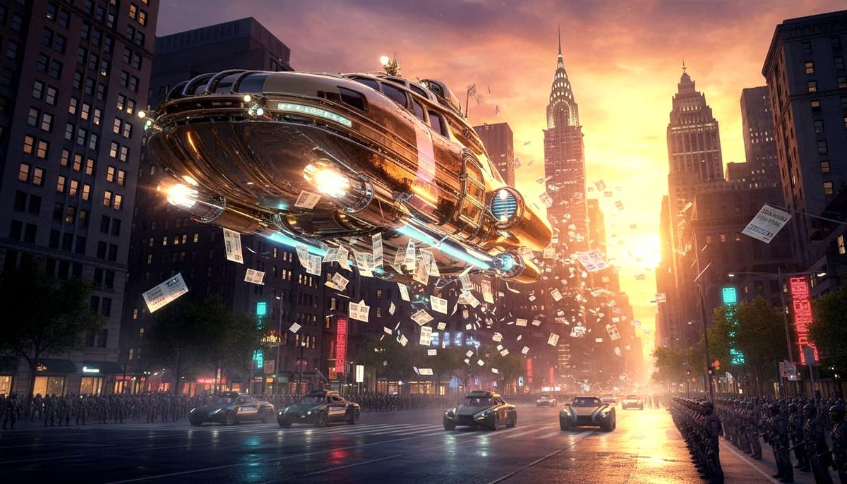 ein sehr oppulentes fliegendes Auto kreuzt die 5th Avenue in New York in 300 Metern Höhe und wirft Flugblätter über der abendlichen stadt in einem wunderschön strahlenden licht des Sonnenuntergangs während auf der Straße eine Militärparade entlang fährt 4K 64 megapixels 8K resolution wide-angle lens ...