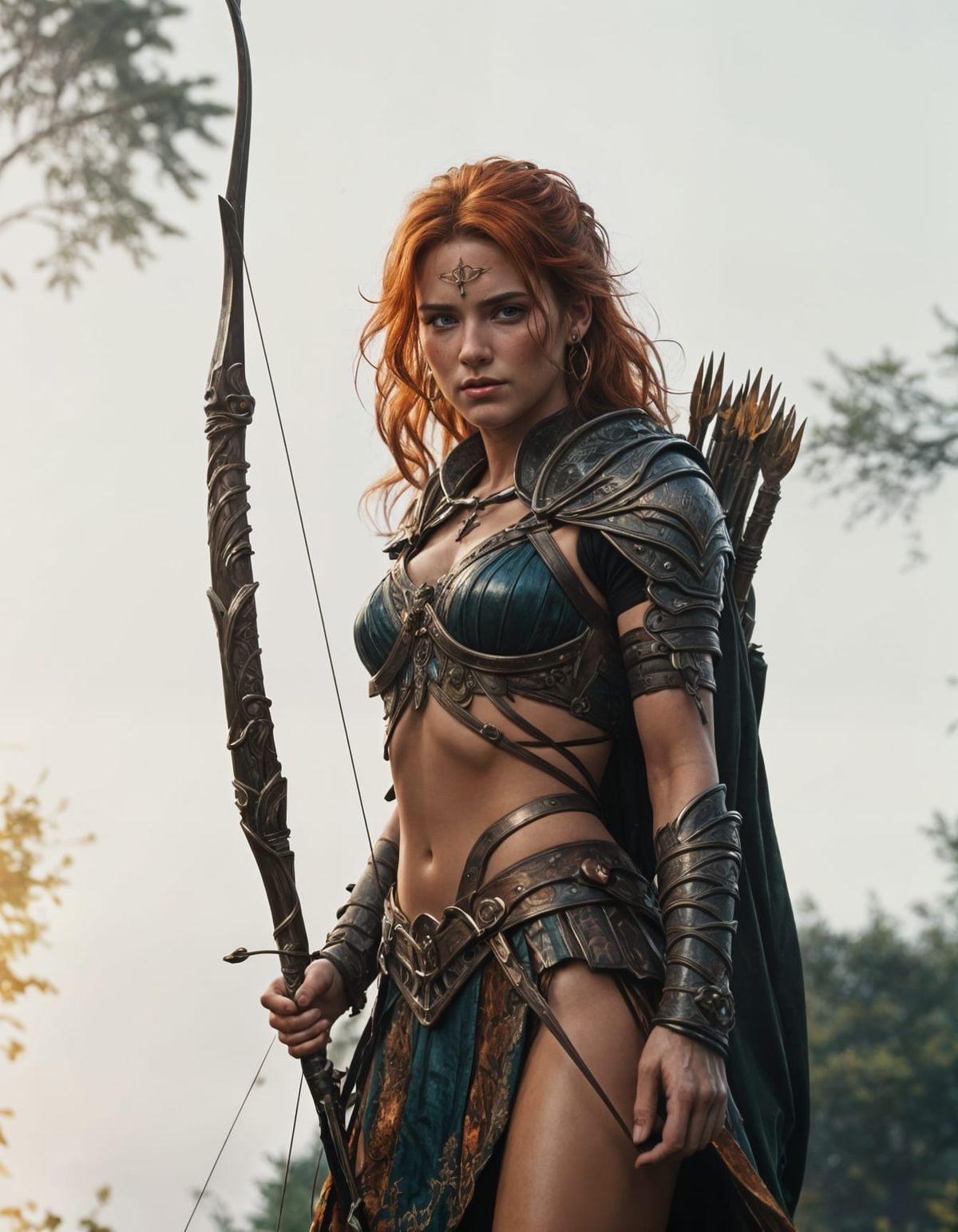A vivid image of a Zaunite archer with an epic bow in an enchanted forest. The character has striking features and wears arcane armor, all rendered with dynamic lighting and intricate details.